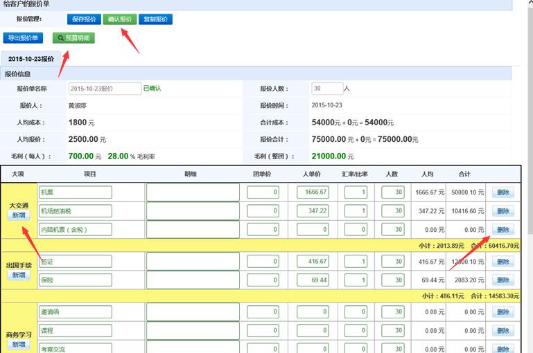 人单价:有些项目是按照人来设定价格的,比如机票、酒店、签证等等,费用都是每增加一个人就多出一份成本,这是我们就需要将这类价格填写在人单价中。